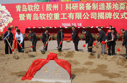中國石化協會會長李勇武對公司此戰略舉動高度評價,認為軟控一直在努力實現中國老橡膠人多年的夢想,他還進一步表達了對軟控的殷切期望,并與山東省政協副主席、工商聯主席王乃靜,青島市人大常委會主任張若飛,膠州市委書記祝華一起為軟控重工揭牌;全體到場嘉賓共同為“基地”奠基。