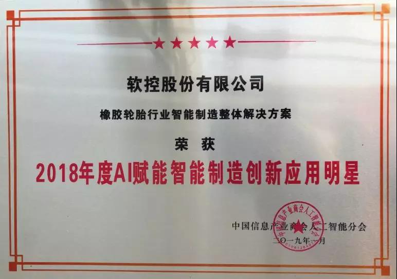 1月20日,由中國信息產業商會人工智能分會組織評選的2018年度信息產業創新發展明星(人工智能方向)企業名單揭曉,軟控股份有限公司憑借橡膠輪胎行業智能制造整體解決方案從眾多參評廠商的產品方案中脫穎而出,榮獲“2018年度AI賦能智能制造創新應用明星”。
