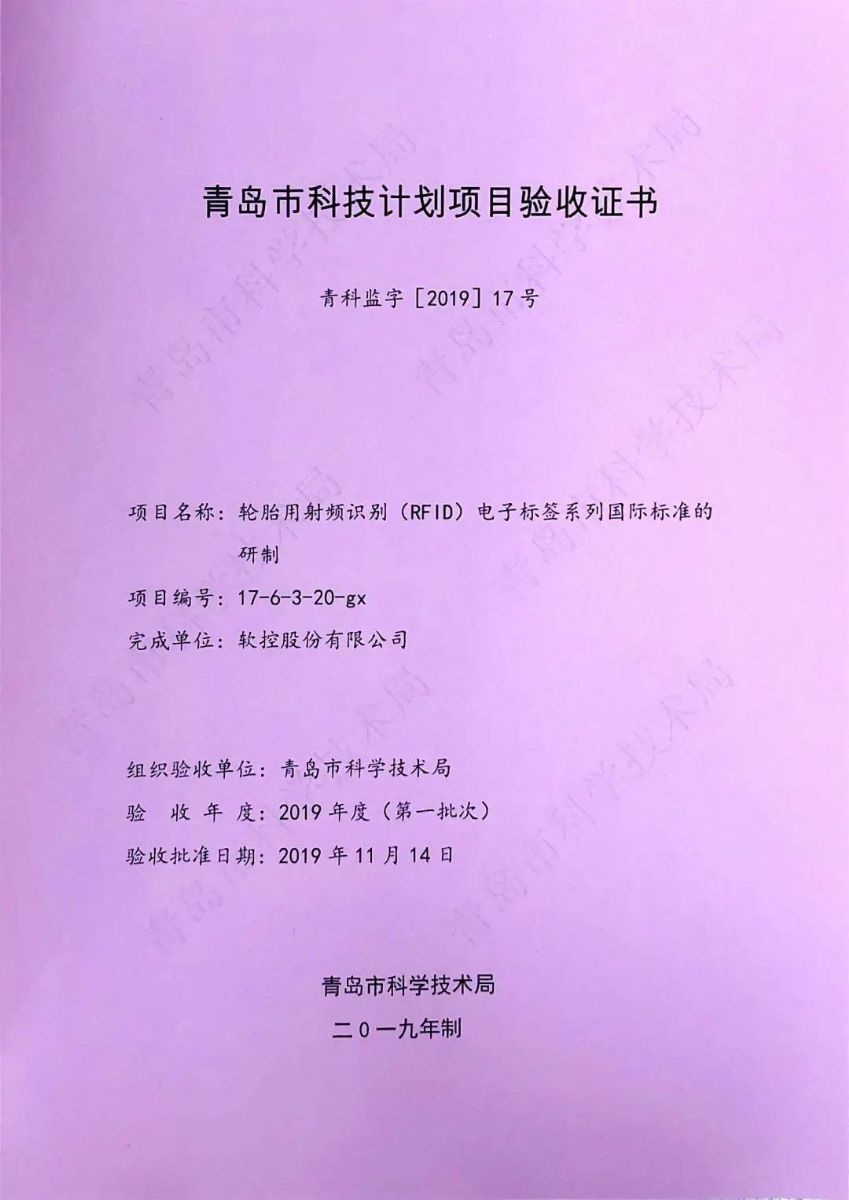 近日,軟控承擔的2017年青島市民生科技計劃項目“輪胎用射頻識別(RFID)電子標簽系列國際標準的研制”順利完成全部驗收工作,青島市科學技術局下發青島市科技計劃項目驗收證書。