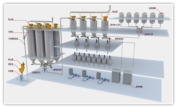 2、粘性較大物料(鈦白粉、炭黑等)的氣力輸送系統;