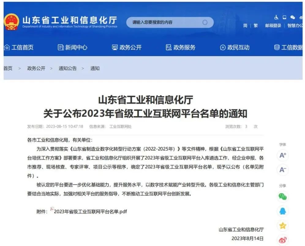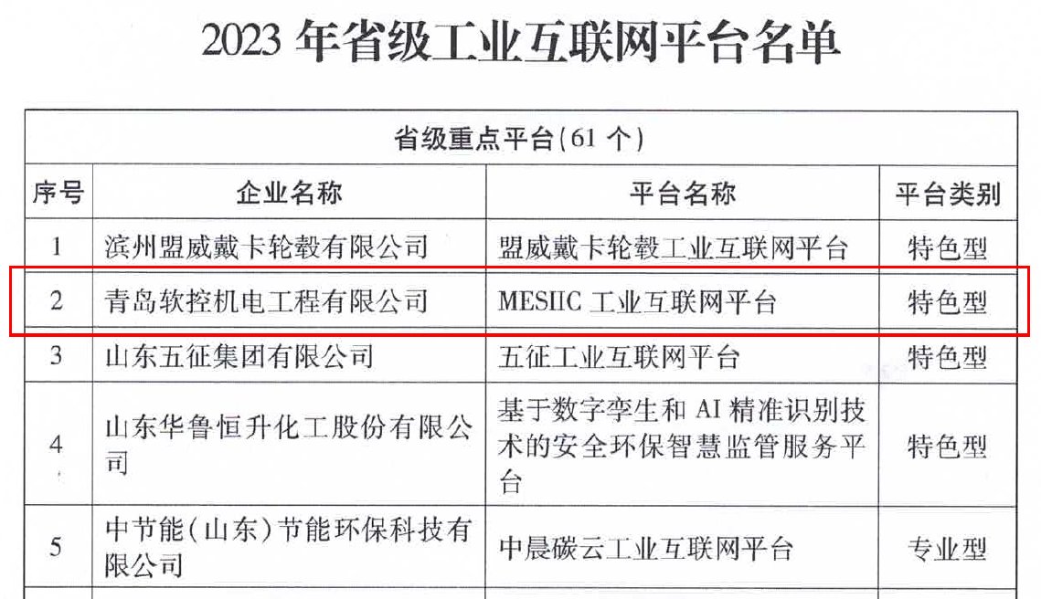 8月14日,山東省工業(yè)和信息化廳公布2023年省級工業(yè)互聯(lián)網(wǎng)平臺名單,青島軟控機電工程有限公司的“MESIIC工業(yè)互聯(lián)網(wǎng)平臺”成功入選省級重點平臺(特色型)。